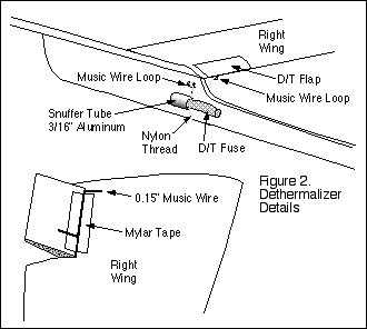 The timing element of a dethermalizer is a length of cotton cord(sold by model airplane suppliers such as Sig Manufacturing as"dethermalizer fuse") that burns at about 1/2 inch per minute. Apiece of the appropriate length is cut and installed, ignited justbefore launch, and at the end of its length it burns through a threadthat had been holding down a pop-up aerodynamic surface&emdash;in theD-Light, a wing flap on the wing panel on the right wing (the inboardside of its turn direction.) When the flap pops up, it converts theglider's slow turn into a rapid dive to the ground.
