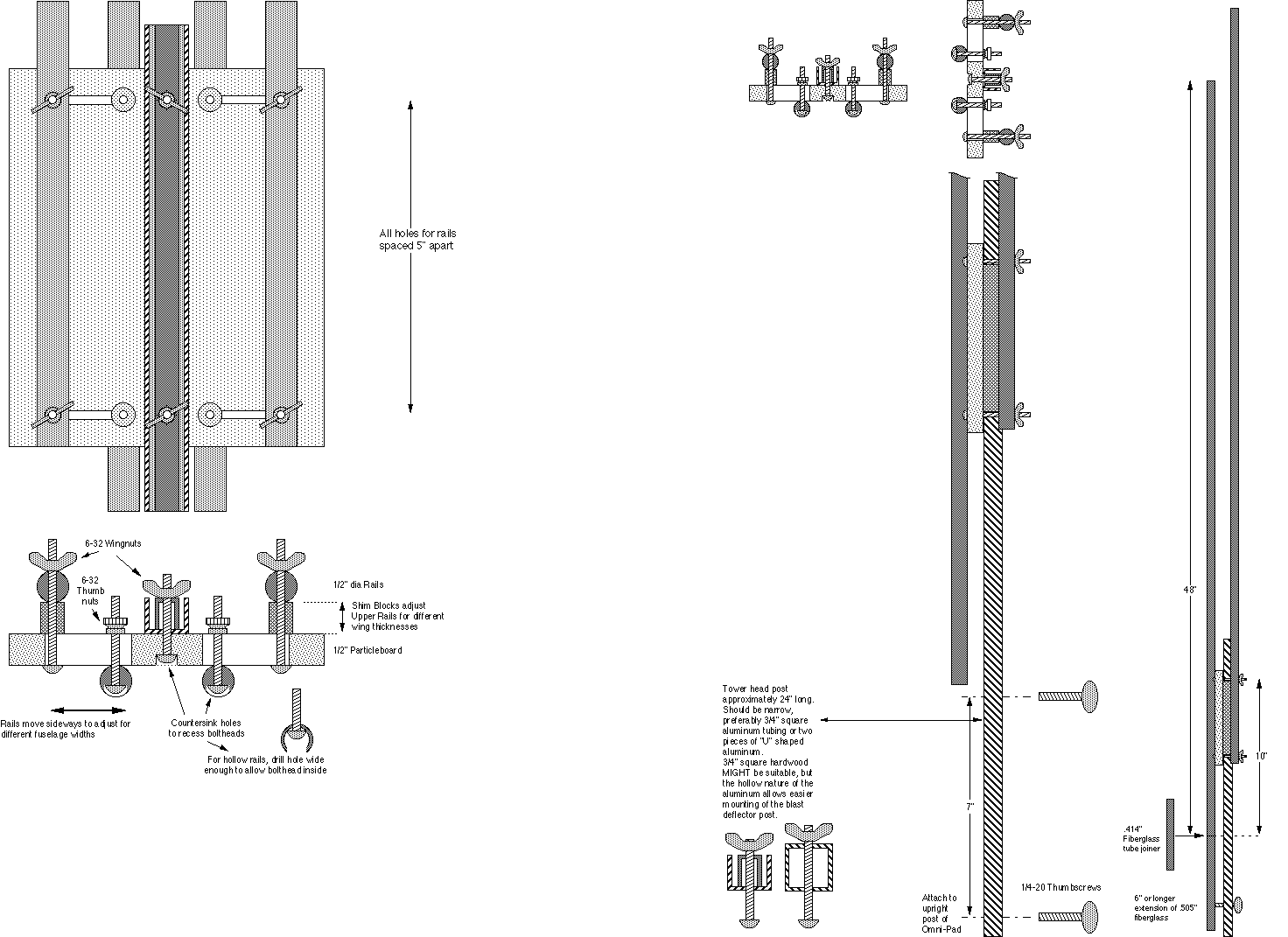 In the early 1990's, I came up with a new design to use an adjustable tower head. Made from 1/2" particleboard, with slots to allow for the inner rails to be moved to allow for fuselage width. And by use of long screws and special spacers, it could b configured to be used for a wide variety of designs. Ed LaCroix made several of those, for his own use and made some spares that were sold to a few other fliers who were interested.