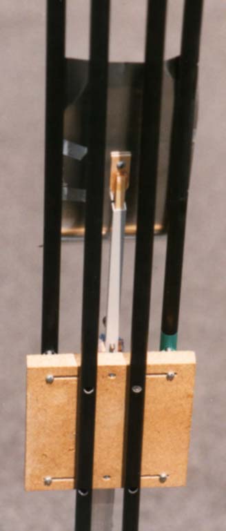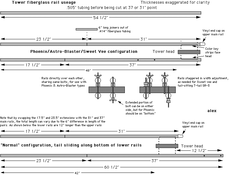 The tower rails were adopted from ones that had already been used by other U.S. member for their R/C R/G towers and Contest Model towers. Rails made of .505" fiberglass tubing, with joiners made of .414" fiberglass tubing. It is surprising the number of people who have seen those black resin fiberglass rails and assumed those were highly expensive graphite tubes.
