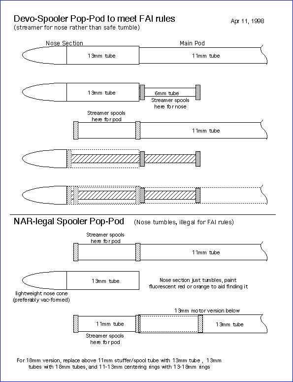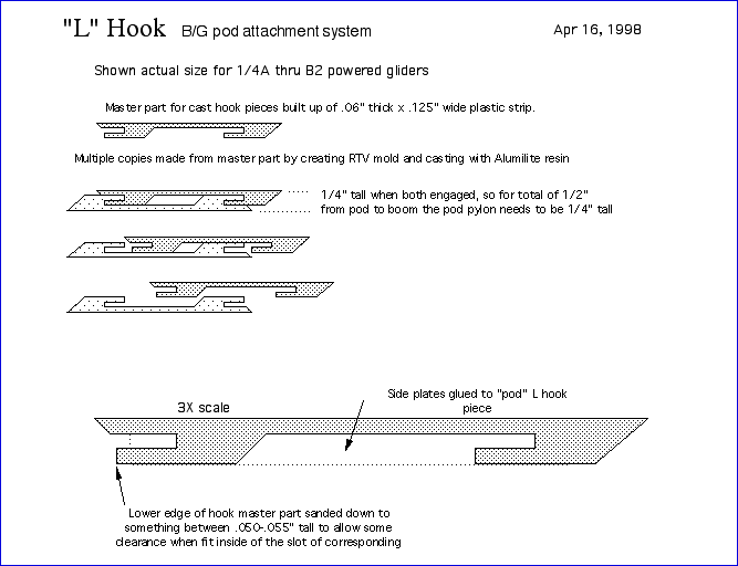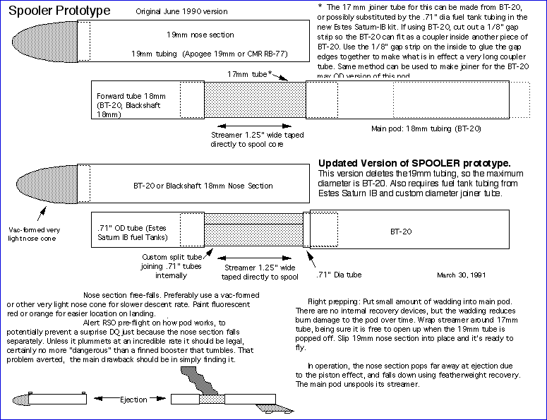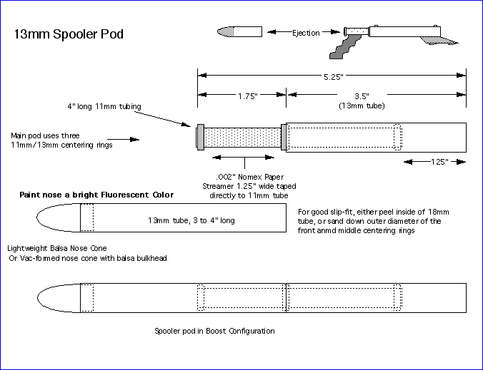 Report Summary: This report is on the development of a pop-pod system which addresses two significant problems for those who fly Boost Gliders. One problem was the pop-pod getting hung up on the glider after ejection, commonly called a Red Baron. Through a series of design improvements and testing, a pop-pod system called "Spooler" was developed. The Spooler ejects off the nose section, which tumbles down safely, exposing a wrapped up (spooled) streamer in the main pod so it can unspool and bring the main pod down safely The other problem was how the glider attaches to the pod. Common hook attachment methods are sometimes too loose so the glider comes off early, too tight so the glider does not come off of the pod at all, or inconsistent fit between different pods and gliders of the same design. This problem was first attacked by the use of a "universal" cast glider hook design, later sold commercially by Apogee Components. However, that design had some drawbacks in allowing gliders to come off a bit too easily, and were somewhat large. So, a dual interlocking hook system was developed, which did not allow the glider to come off until the pod slid backwards a certain distance (usually 1/4") at ejection. Called the "L Hook" due to the hooks being similar to very short but wide "L's", they also have a lower profile than the Apogee Universal hooks. Being cast parts, they have a consistency of fit that allows any glider to be attached to and flown by any pod that uses the same hook size. When combined, a Spooler Pod and cast L hooks make for a very reliable pop-pod system for Boost Gliders.