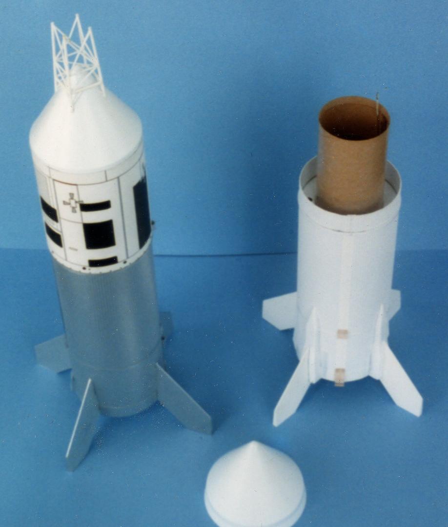 A Boilerplate model was built to explore the construction using corrugated plastic sheet curled into a tube, fin attachment, and BT-80 tube for recovery compartment (with a printed wrapper for the Service Module pattern). Service Module slips on and is replaceable. In both photos at right, the Boilerplate is seen with a sivler body, and a paper printed wrap on the Service Module