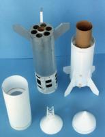 The Regional Model seen here was built with a 29mm engine mount. The NARAM model was built with a 24mm mount, to fly on E15 power. A baffle system was used inside of a BT-80 tube, to store the parachutes. Over time I regretted not having something larger than BT-80 inside, such as a 3" or 3.25" tube to allow for more room to store the chutes and shock cord.