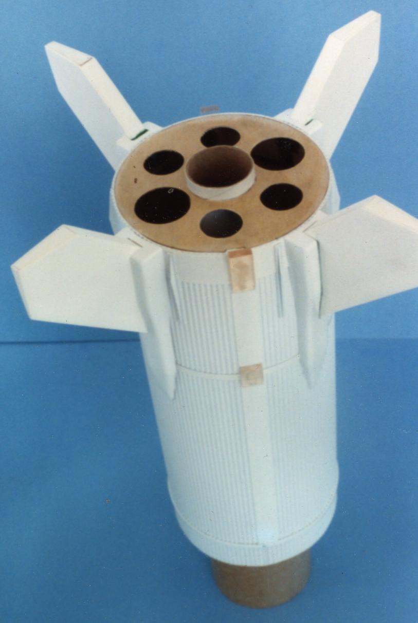 In 1991, I wanted to build a 7" Diameter 1/22 model just for sport flying, not contests. A boilerplate was built out of poster paper. It flew on a G25 and six C6's. It also happened to be my HPR Level 1 Cert flight, in those days a person certified on a G.