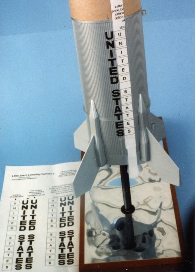 The final of the big three problems to solve for building a Little Joe-II was how to do the UNITED STATES lettering so it would conform with the corrugated body. Solid black decal film would be used for the letters. First I simply cut different widths of decal film and applied them to some test corrugations, and found just the right width to fit across exactly three corrugations. Then I drew up the lettering and adjusted the width of the lettering to match the width as determined by the decal tests.