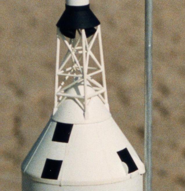 In 1989, I teamed with Wayne Hendricks (Southern Comfort Team). Wayne had been interested in our team developing a scale model of the Little Joe-II, and had built his own 4" diameter prototype. Plus for sport flying he loved flying 7 engine clusters in a Little Joe-II model. I had not considered doing a Little Joe-II as a serious scale model before, as my scale skills in early years were poor. But by 1989, they were getting a lot better. I found ways to do the three most critical parts of the model - scratchbuilt LES Tower, corrugated body, and the UNITED STATES Lettering to conform accurately to the corrugations. And Wayne arranged to get an aluminum mandrel made up for vac-forming the Capsules/BPC's.