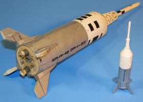 The model was built at 1/100 scale, as the Centuri and Estes kits were. This one was for A-002, perhaps he first time anyone had modeled A-002 for a NARAM (or any meet?). I used more advanced fabrication methods for that model than I had for the previous ones. Especially regarding Alumilite cast parts and RTV molds. The Peanut model suffered a bit due to its tiny size. The UNITED STATES lettering was done by clear decal, and the clear decal film was visible, so that hurt the score somewhat.