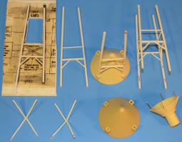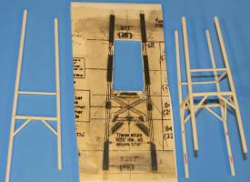 Another special jig was made for gluing together the "X" struts, cut from 4 pieces of 1/16" plastic rod. Pre-printed cutting guides were used to help trim them to the correct angles and length. The jig for the "X" struts was bowed inwards, the same as the real thing. Once an X strut was completed and fully dried, it was glued to one side of the tower assembly, and the process repeated for the other three.