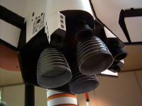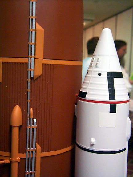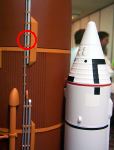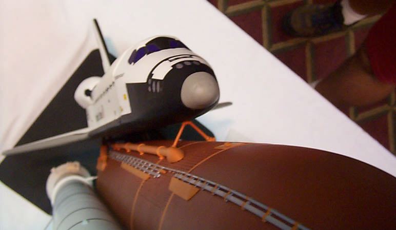 The whole model never was together until minutes before taking it to turn-in Monday night. Ed LaCroix brought in the neat display stand he made up, freshly painted black. The build-up process began with putting the ET onto the stand, then the SRB's, then the ET nose, and finally the orbiter. The Flights As some of you know, the first flight did not go well. It took off OK, flight path was OK, even sepped the SRB's OK. But from there things went badly. There were about 3 separate problems on the first flight it seems, and of course none had cropped up before in the 9 previous flights of the 1998 version boilerplate the NARAM model is based on. First was the ET nose came off shortly after the flight computer commanded SRB sep. The ET nose had been a bit loose and now I know it was too loose. That is a major problem for this since the ET nose has 6 wires connected to the main ET by means of a 6-conductor telephone jack/plug set, and when the nose came off it no longer could "see" orbiter sep that the computer uses as a key event to fire the ejection 1 second later. But the programming is supposed to fire the ejection if the orbiter is "late" in separating, there's a 4 second window from computer-commanded SRB sep to sep the orbiter by R/C. I do not know at the moment if the programming did not account for that condition or something as basic as the computer battery also going out about that time. So in any case it was fortunate that at least the ET main chutes got yanked out, since all the chutes are stored tightly in about 4" of space in a BT-80 in the ET nose (chutes meant to be blown out rearward by a piston when an electronic ejection charge goes off). And it seems the ET nose chutes got out (?) but didn't deploy, which if that was the case is a totally separate and screwy problem if both were out and both failed to deploy. Again, have to check video footage. The last goofy thing was that the orbiter didn't sep when commanded by R/C. I later found there was a problem in the programming I did in the computer transmitter where the transmitter's landing gear switch position affected the throw of the sep servo, I didn't realize the gear switch was in the chain of the programming (in other words I had needed to disable the gear switch from a default setting and overlooked it). To do the actual separation I flip a different switch, a boost/glide master switch, which is programmed to not only sep the orbiter but to change values for throws and to change the elevator trim for "uptrim" for glide). Considering that the orbiter never sepped, and it is not known yet why the computer didn't cause ejection once the allowed orbiter sep window expired, it might have been fortunate after all that the ET nose came off and at least got the ET main chutes out. If the ET and orbiter had plummeted down, there would have been little more than two SRB's left from that model. The ET main's chutes were not meant to bring the ET and 240 gram orbiter down together at the same time, so not only was the landing rough on the ET, bashing in the vac-formed aft dome, but also rough on the orbiter (which of course was not intended to "back into" the ground). The body flap was knocked off, one OMS pod popped off, one of the main engines was damaged, and a balsa spar inside the vertical tail (rudder assembly ) was cracked. Also one of the elevons was bent upwards by 10 degrees, fortunately it was possible to bend it back (The brass rod used as a torque rod on that elevon was bent). Jay Marsh and I set about doing repairs. There were a few moments during the attempt to get it ready to fly again that it looked like it might be "game over". Foremost was the flight computer. It was not responding at all, and considering the ET nose had crashed then it was looking like the computer was damaged. Jay carefully checked it over to try to pinpoint the problem. Fortunately it turned out to be that the 50 mAh 9.6 volt nicad pack was bad, one of the solder tabs must have broken loose when the ET nose hit. Fortunately there was a back-up wiring harness to plug in series two 4.8 volt 50 mAh packs as used for R/C RBG's. So, the computer "took a licking but kept on ticking" (didn't hurt that it was mounted inside a hardened "capsule"). Also for awhile the aft launch lug was missing (not known if it came off at launch or landing). The model is C-rail launched and has to have two lugs. If it had not been found then then it was likely the remaining upper lug would have been cut two halves and gluing one of the halves to the bottom. Good thing it didn't come to that. The ET/Orbiter attachments were also of concern. The two 1/16" brass pins that go perpendicular from the ET aft struts inside the orbiter to transfer the acceleration (push) loads to the orbiter were broken away forward, the cast struts had cracked along the 1/16" holes the pins were mounted into. Fortunately those were fixable by applying thick CA. Various other repairs to other pieces too, mostly minor. It was at least fortunate that no key part was damaged, or damaged beyond repair - there are some pieces where there is no practical field repair possible if they break, like an aft SRB/ET attach strut....."game over". Finally it was all fixed and ready to fly again. It pitched a little bit off-vertical but not too badly, and shortly after burnout the computer sepped the SRB's. OK, that's where flight 1 stopped going well. This time, ET nose stayed on, and the orbiter/ET coasted along for about 2 seconds then I commanded orbiter sep and it came off cleanly, right into a glide (unlike the 1998 boilerplate, this one was not built to "stage" by firing an A3 in the orbiter at orbiter sep). Now glide was the part of the flight that was a big question in the previous months. There never was any opportunity to check the glide trim of that new orbiter (Well, if I'd really wanted to I would, but it's too big a risk to do with a "real" scale model) . The best that could be done was to try 