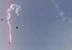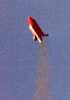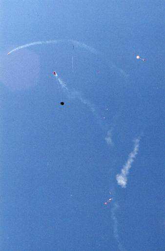 Flight #3 of the launch - Orbiter has staged, coasting with a smoke trail at upper left. ET main is deploying chutes. SRB chutes deployed.