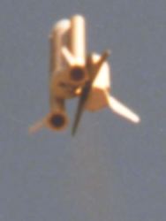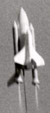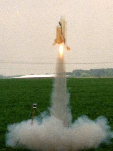 It flew 3 times at NARAM with a lot of things learned. The first flight was the first time to have the SRB's sep and the ET/Orbiter keep going. The SRB's sepped and tumbled much like the real thing. Unfortunately the ET didn't eject its chutes on that flight as the electronic ejection charge didn't have enough black powder in it. Second flight was almost ideal, though the SRB's were a bit late in sepping (not quite enough spring strength to push back the sliding engine casing to detect burnout). SRB's sepped after apogee, Orbiter was sepped shortly after, and 1 sec later the ET ejected its chutes. Third flight was a near-disaster as it went into a barrel-roll bucking bronco boost. Sepped the orbiter by R/C near burnout and fortunately the ET ejected before hitting the ground. That flight's problem was pegged on a loose rubber band. The forward portions of the SRB's were literally strapped against the ET by external rubber bands (for SRB release, a servo retracted a pin to release one end of each rubber band, allowing a perpendicular spring to push the SRB outwards). One of the bands had become too weak and allowed an SRB to nearly come off during boost, pivoting outwards a few degrees. This shuttle uses a single fin on each SRB at 45 degrees down from the wing, so such a pivoting outward by the SRB produced not only some odd yaw but some right roll and down pitch by the fin attitude at the unusual yaw angle.
