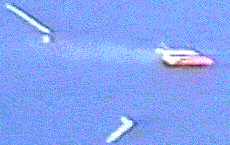 Shown at left are the ET and SRB's after orbiter sep and staging. Main ET has black chutes. ET Nose is just ot the right with its two chutes. Far right are the two SRB's, one with two chutes and the other with only one chute deployed.