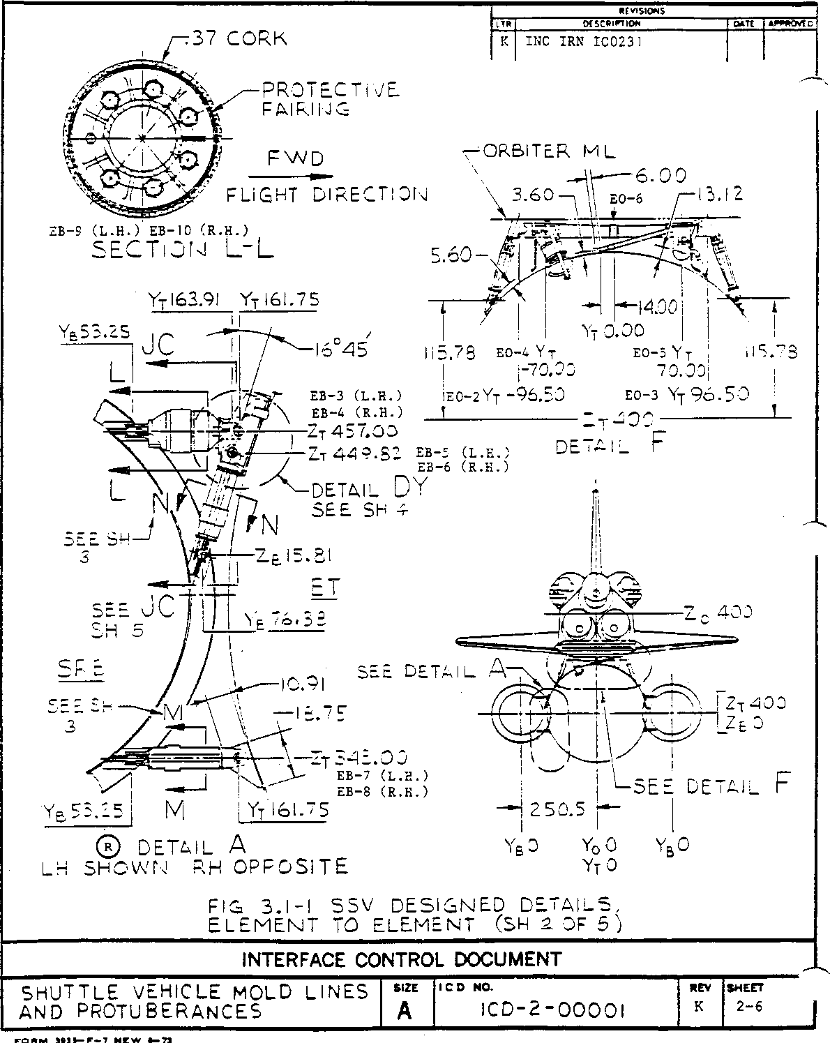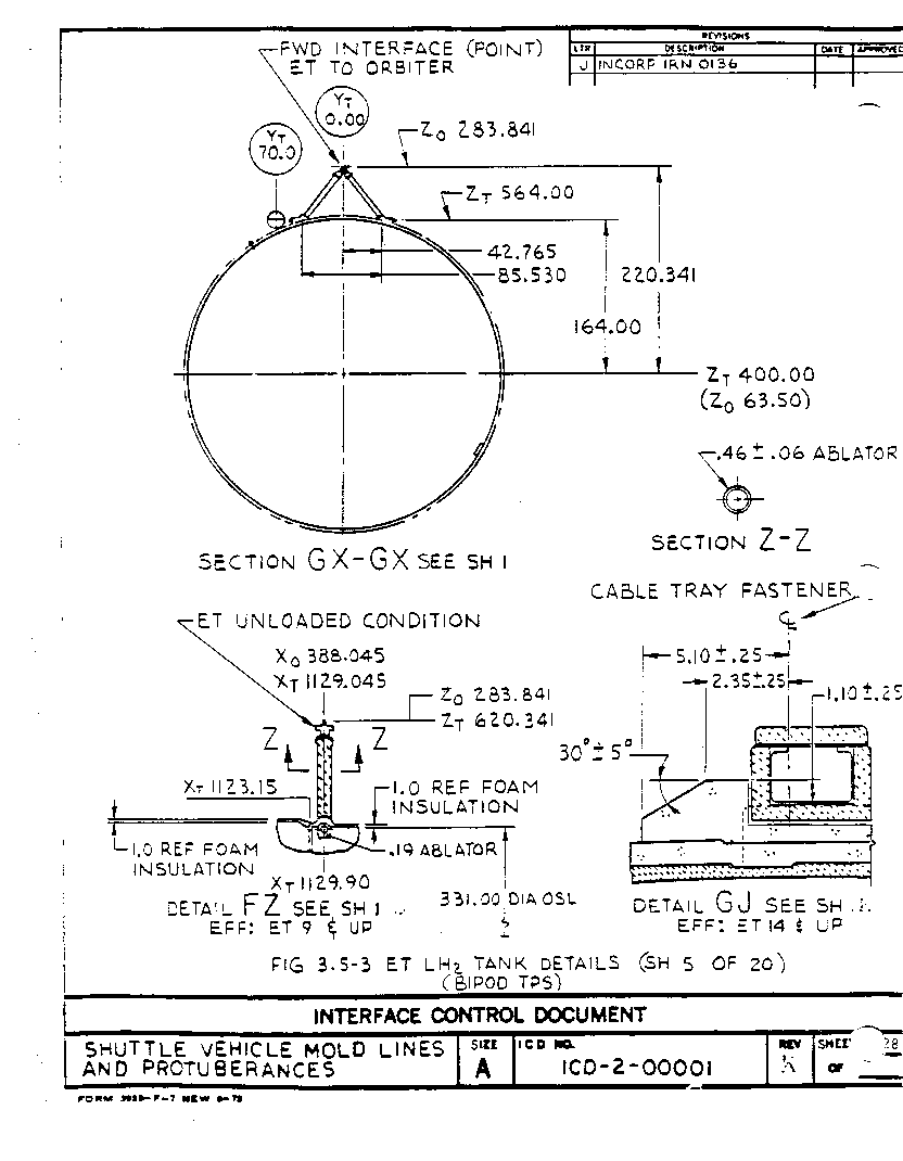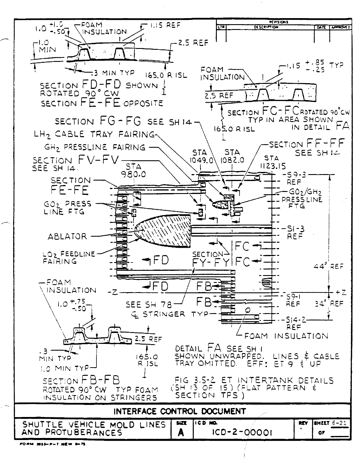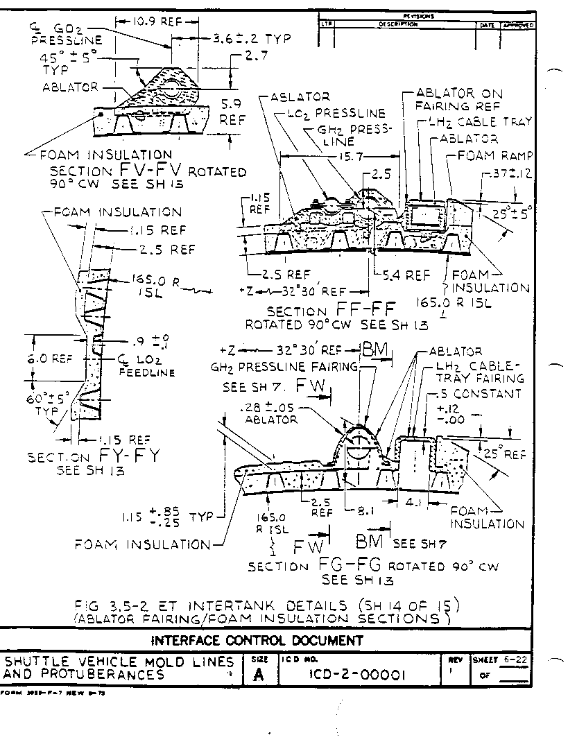 | ICD stands for Interface Control Document. It defines the external surface of a launch vehicle. Jimmy Williams obtained an ICD with a great deal of information on the shuttle ET and SRB's. Most of the drawings here are scans from that ICD. There are still many pages from that ICD which have not been scanned yet. Most of these are from ICD-2-00001 "Shuttle Vehicle Mold Lines and Protuberances" 7/31/91 A few other pages are from a Rockwell ICD defining portions of the orbiter. |
