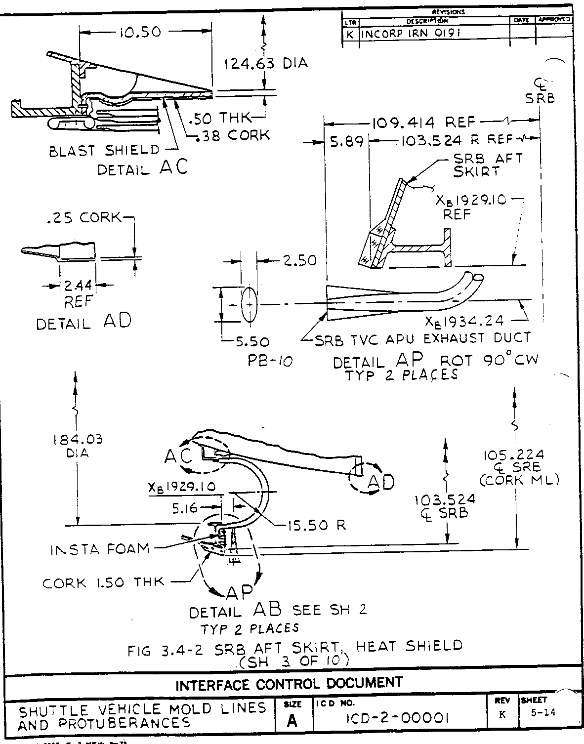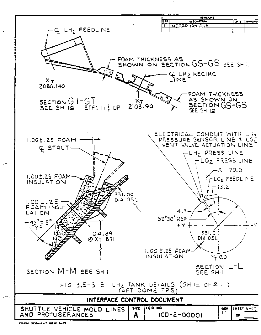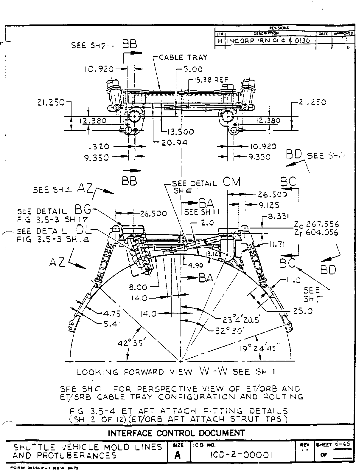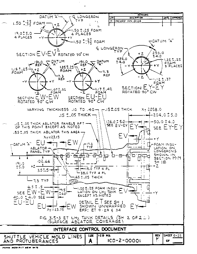 | ICD stands for Interface Control Document. It defines the external surface of a launch vehicle. Jimmy Williams obtained an ICD with a great deal of information on the shuttle ET and SRB's. Most of the drawings here are scans from that ICD. There are still many pages from that ICD which have not been scanned yet. Most of these are from ICD-2-00001 "Shuttle Vehicle Mold Lines and Protuberances" 7/31/91 A few other pages are from a Rockwell ICD defining portions of the orbiter. |