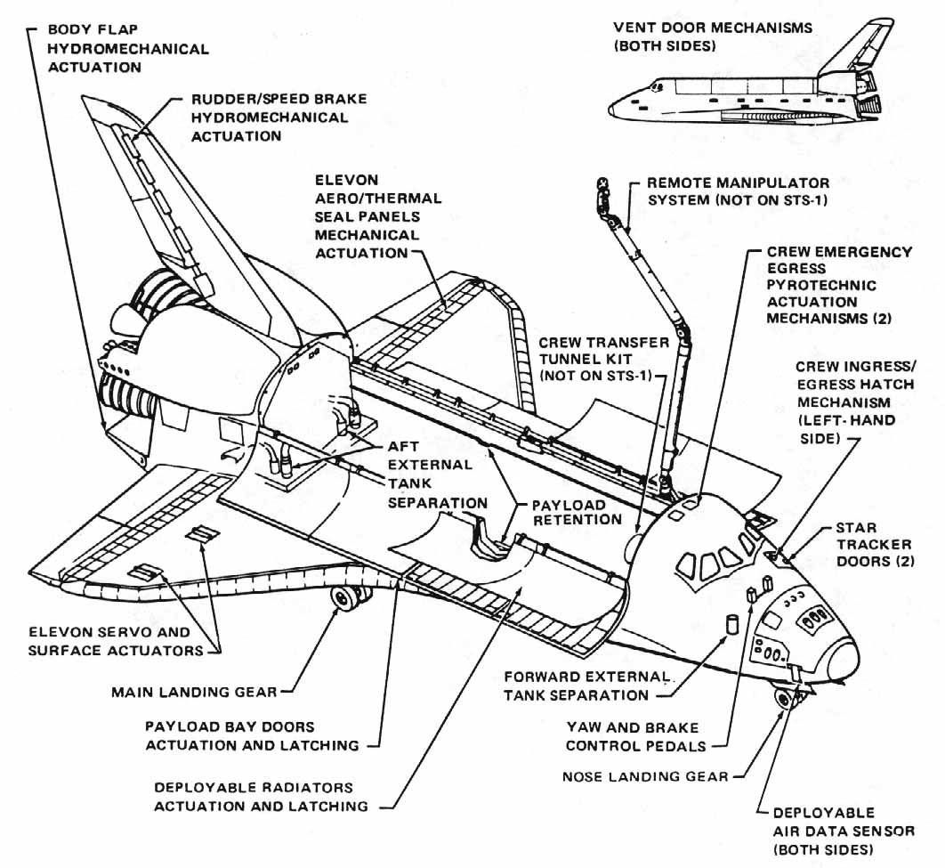 | Aft Compartment of orbiters have T-0 umbilical connections on the sides. These carry Liquid Hydrogen and Liquid Oxygen to load the ET, as well as various other connections from the pad to the shuttle. They stay connected until liftoff, thus the "T-0" name. | | | | aft_fuselage_2-small.gif |